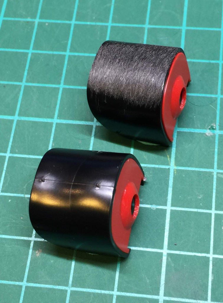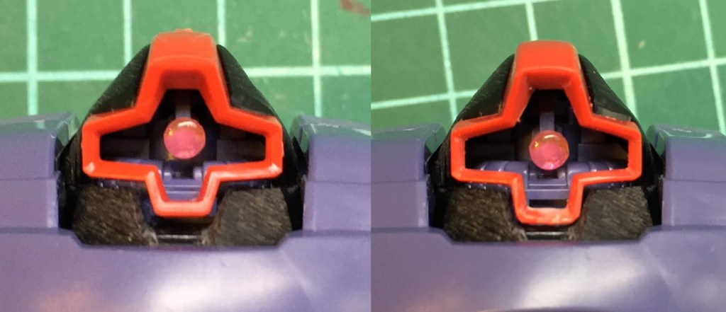 ① モノアイシールドの拡張と下側に向けて0.5ミリ拡張。やや旧キットよりの台形の表情に。