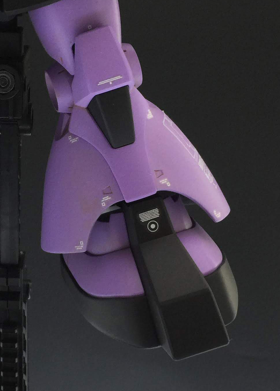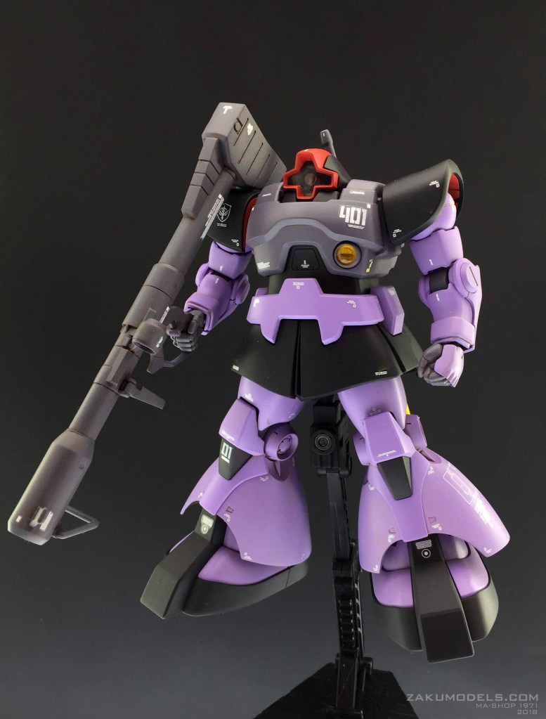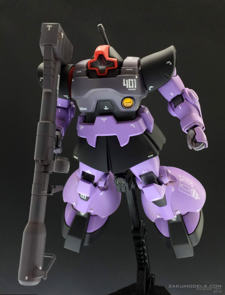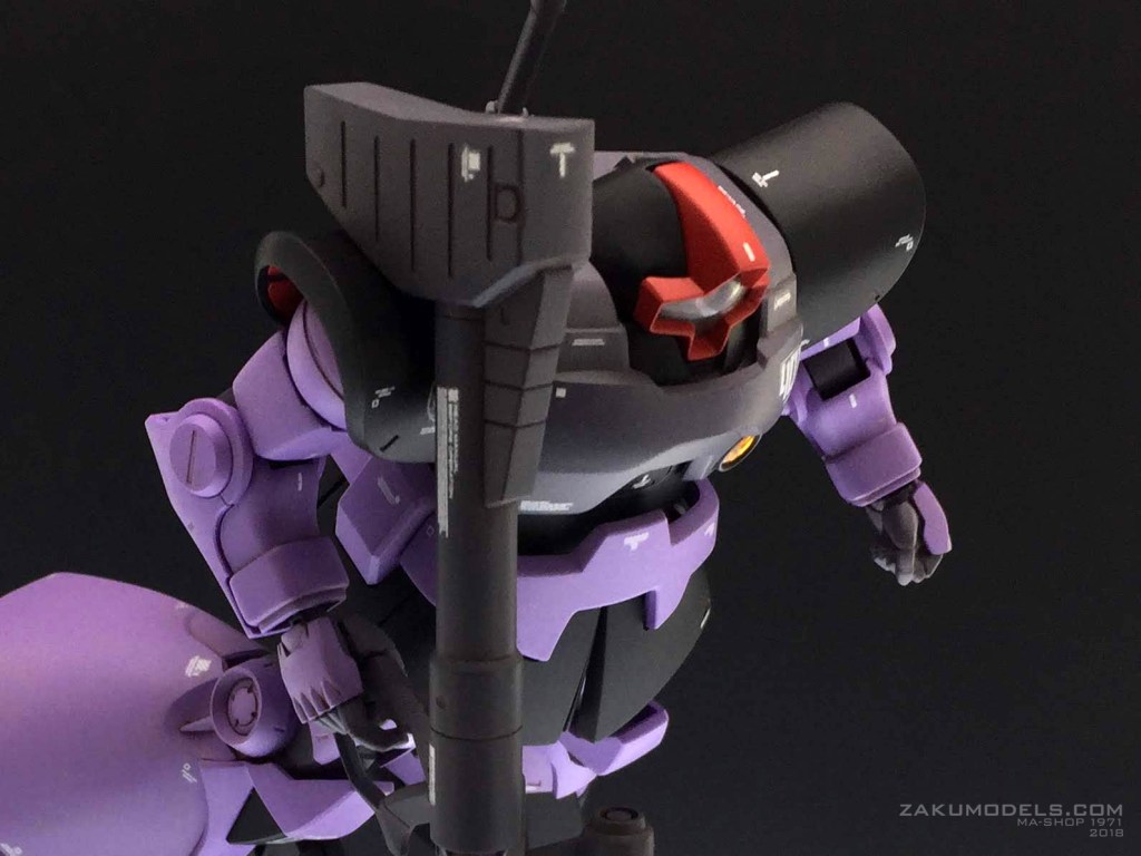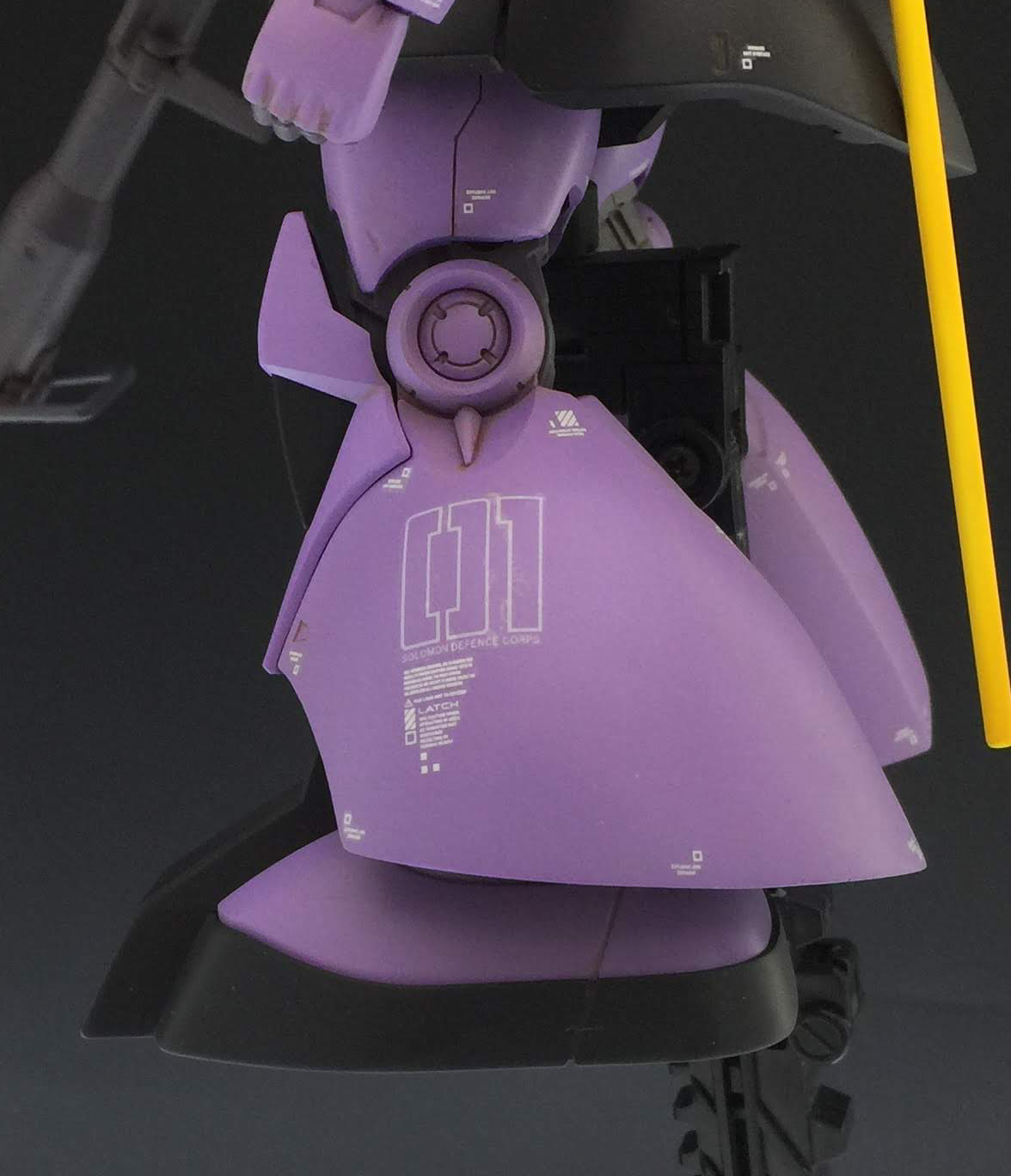 大好きなジオノや他の作例を参考にやりすぎを感じたものは抑え気味に、必要を感じたものは強調する方向で。ジョニザクの補佐役という設定で、シャアとドレンよろしく、部隊の隊長で中尉という位置づけ。ジョニザクはVIP、隊の指揮は基本このドムが摂る形。コーションマーク以外はMDプリンターの自作デカールを使用しています。 モデックスはジョニザクと同書体。01は隊長の意。 ジオン国章は今回盾章にして主張を抑えてみました。