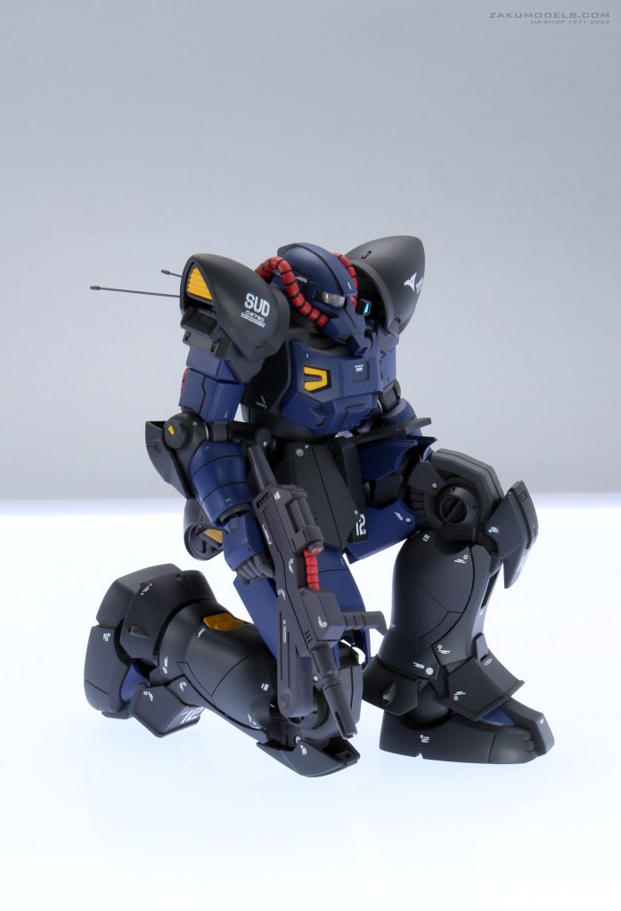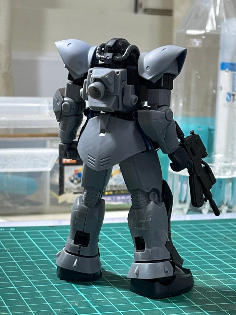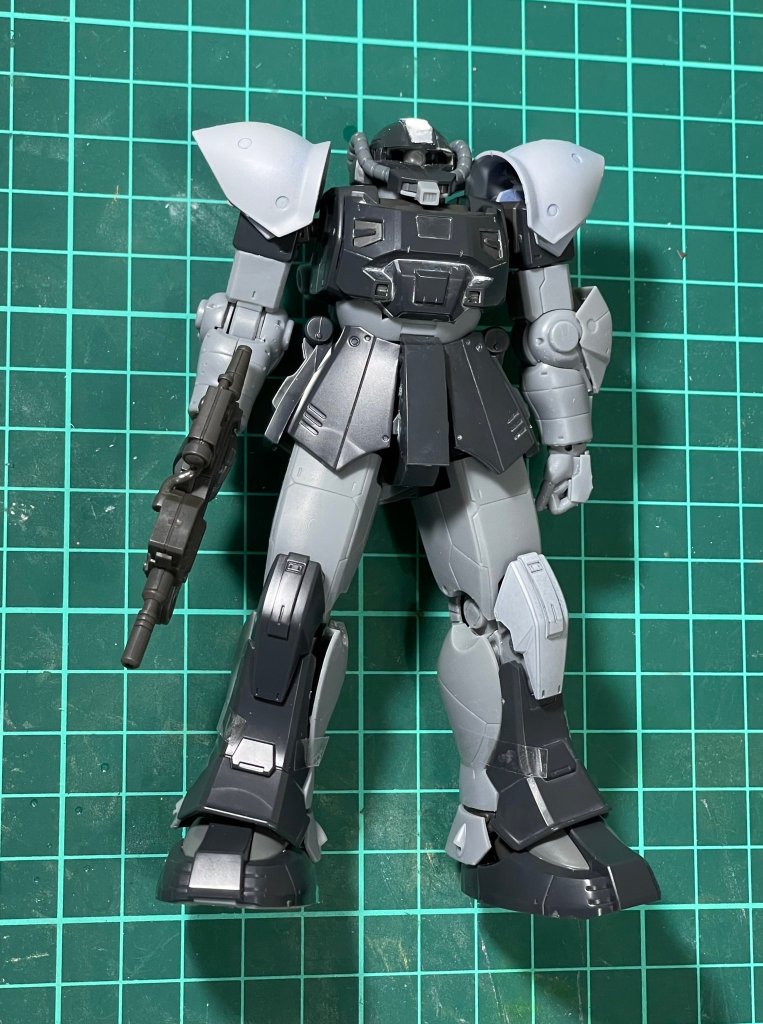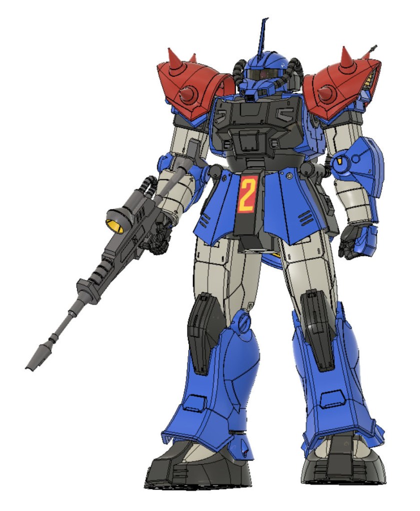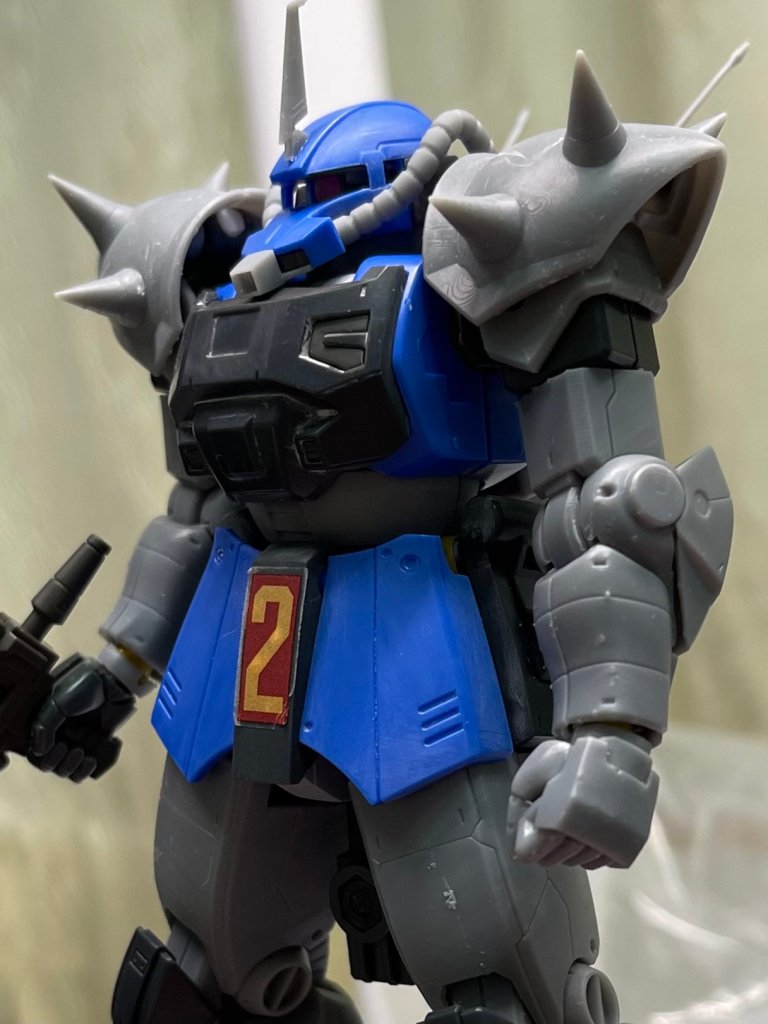 元設定の肩アーマーには無いジオノMSD版で追加された円ディティールをスパイク取り付け部と解釈したもの(ややこしい)。思いのほかジオン味が強化されなんというか「スパイクがないやつは牙を抜かれた連邦版~?」みたいな世界線が生じかけました。イフリートに似てるなと思った事もあり二ムバス機としましたが公式のアクト・ザクパイロットであるマレット・サンギーヌ機やキシリア隊等いろいろイメージが拡張出来そうで楽しいです。